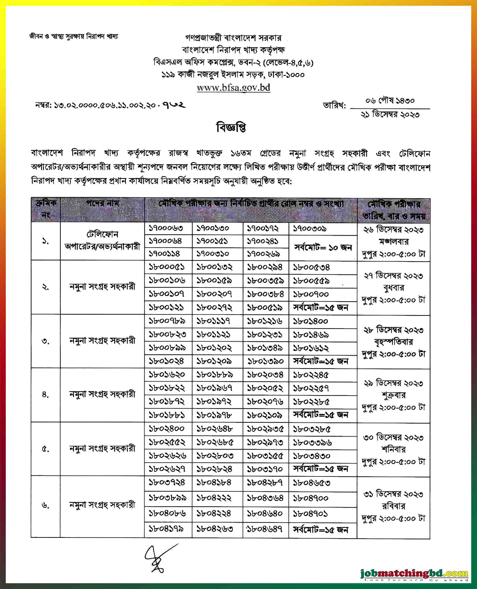 বাংলাদেশ নিরাপদ খাদ্য কর্তৃপক্ষের রাজস্ব খাতভুক্ত ১৬তম গ্রেডের নমুনা সংগ্রহ সহকারী এবং টেলিফোন অপারেটর/অভ্যর্থনাকারীর অস্থায়ী শূন্যপদে জনবল নিয়োগের লক্ষ্যে লিখিত পরীক্ষায় উত্তীর্ণ প্রার্থীদের মৌখিক পরীক্ষা বাংলাদেশ নিরাপদ খাদ্য কর্তৃপক্ষের প্রধান কার্যালয়ে নিম্নবর্ণিত সময়সূচি অনুযায়ী অনুষ্ঠিত হবে: