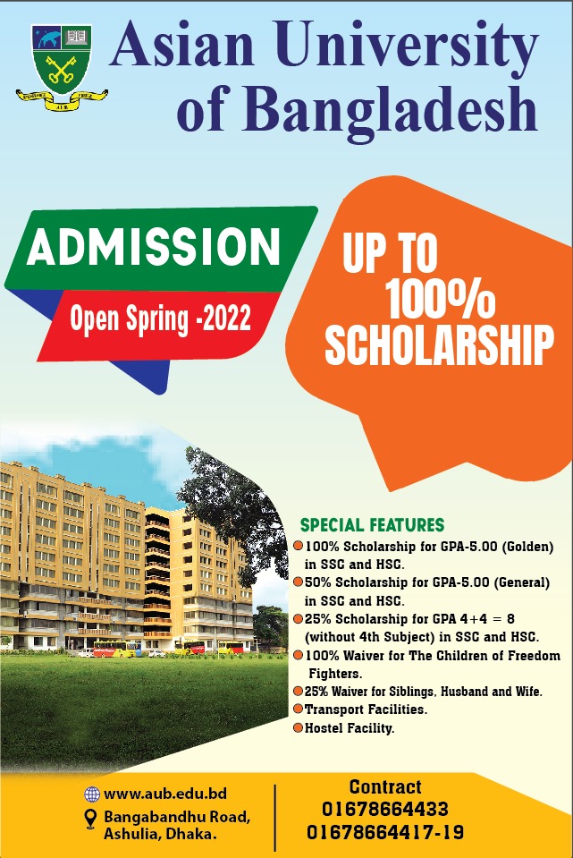 Asian University of Bangladesh | Admission Up to 100% Scholarship Mahmud August 24, 2022 Admission News 0 Comments Asian University of Bangladesh | Admission Up to 100% Scholarship AM-21K 611 Share this post Facebook Twitter LinkedIn Post navigation Previous Postবাউবির বিএসসিএজি প্রোগ্রামের ভর্তি কার্যক্রম সাময়িক স্থগিতNext PostGrand Mostafa Hotel Ababil Up To 40% Discount Leave a Comment Cancel reply Your Name Your Email Save my name, email, and website in this browser for the next time I comment. Your Comment Recent News Articles Fresh job related news content posted each day. September 18, 2025 Admission News 0 Comments Rajuk Uttara Model College Admission Open Announcement 2025 SL 66K170 Rajuk Uttara Model College Admission Open Spring 2025 Rajuk Uttara Model ... Read More September 17, 2025 Admission News 0 Comments Barrister Sultan Ahmed Chowdhury Degree College Admission Open Announcement 2025 SL 66K154 Barrister Sultan Ahmed Chowdhury Degree College Admission Open Spring 2025 Barrister ... Read More September 16, 2025 Admission News 0 Comments Fareast International University Admission Announcement 2025 SL 66K144 Fareast International University Admission Open Fall 2024 Fareast International University Admission ... Read More