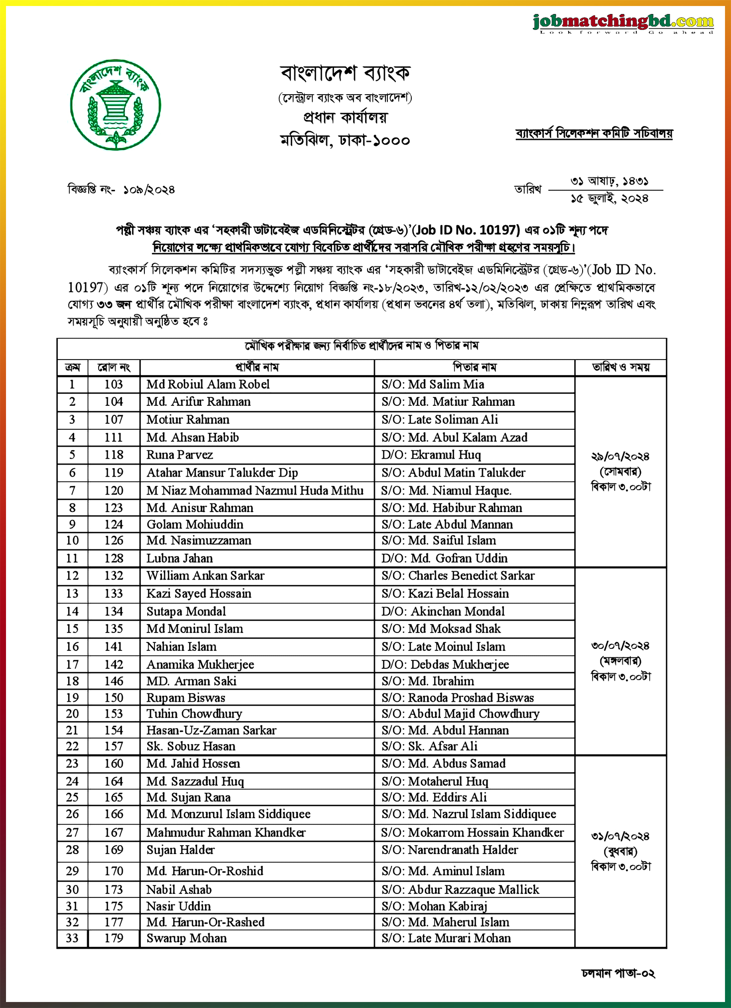 ব্যাংকার্স সিলেকশন কমিটির সদস্যভুক্ত পল্লী সঞ্চয় ব্যাংক এর ‘সহকারী ডাটাবেইজ এডমিনিস্ট্রেটর (গ্রেড-৬)’ (Job ID No. 10197) এর ০১টি শূন্য পদে নিয়োগের উদ্দেশ্যে নিয়োগ বিজ্ঞপ্তি নং-১৮/২০২৩, তারিখ-১২/০২/২০২৩ এর প্রেক্ষিতে প্রাথমিকভাবে যোগ্য ৩৩ জন প্রার্থীর মৌখিক পরীক্ষা বাংলাদেশ ব্যাংক, প্রধান কার্যালয় (প্রধান ভবনের ৪র্থ তলা), মতিঝিল, ঢাকায় নিম্নরূপ তারিখ এবং সময়সূচি অনুযায়ী অনুষ্ঠিত হবে:
