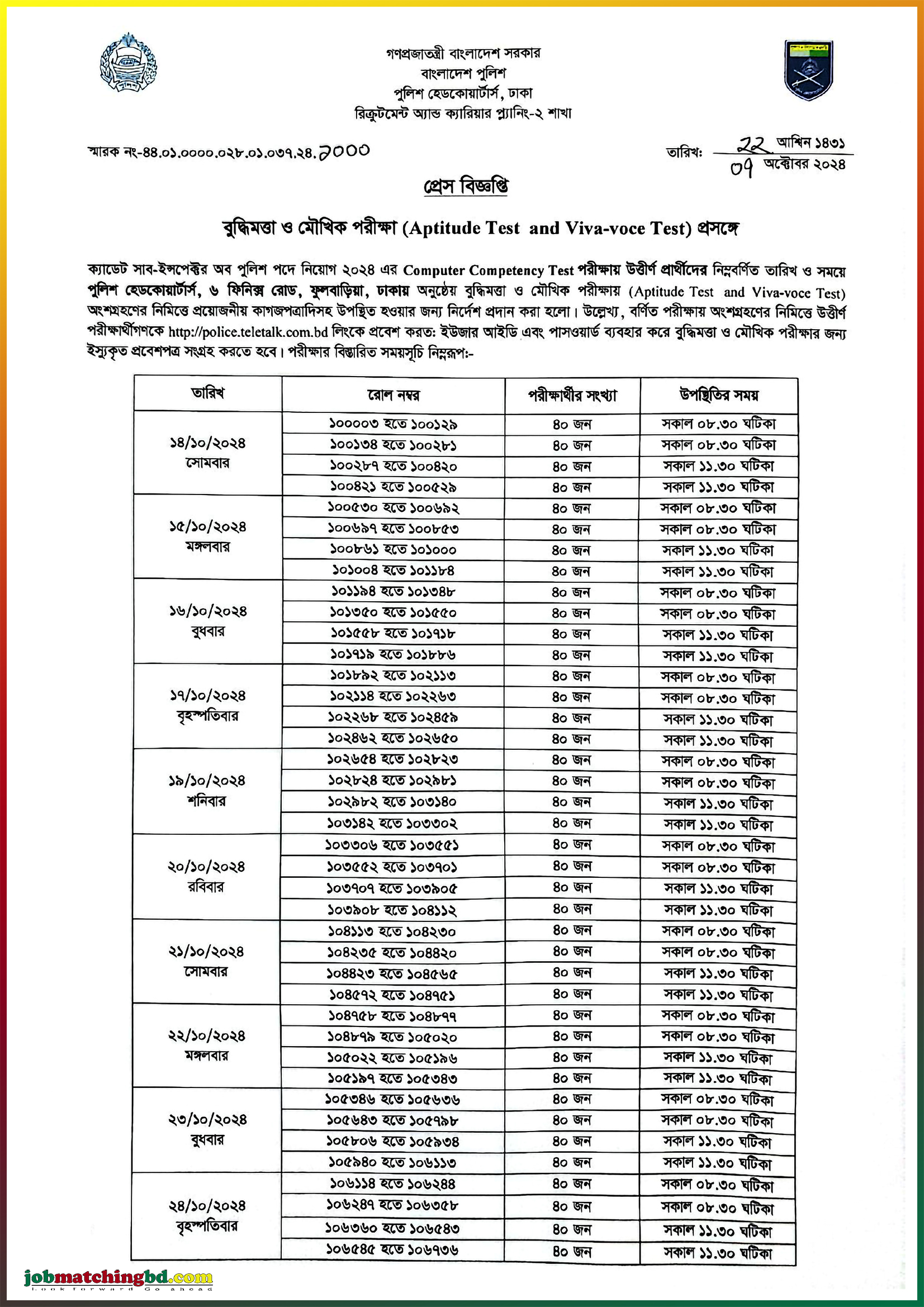 ক্যাডেট সাব-ইন্সপেক্টর অব পুলিশ পদে নিয়োগ ২০২৪ এর Computer Competency Test পরীক্ষায় উত্তীর্ণ প্রার্থীদের নিম্নবর্ণিত তারিখ ও সময়ে পুলিশ হেডকোয়ার্টার্স, ৬ ফিনিক্স রোড, ফুলবাড়িয়া, ঢাকায় অনুষ্ঠেয় বুদ্ধিমত্তা ও মৌখিক পরীক্ষায় (Aptitude Test and Viva-voce Test) অংশগ্রহণের নিমিত্তে প্রয়োজনীয় কাগজপত্রাদিসহ উপস্থিত হওয়ার জন্য নির্দেশ প্রদান করা হলো। উল্লেখ্য, বর্ণিত পরীক্ষায় অংশগ্রহণের নিমিত্তে উত্তীর্ণ পরীক্ষার্থীগণকে http://police.teletalk.com.bd লিংকে প্রবেশ করত: ইউজার আইডি এবং পাসওয়ার্ড ব্যবহার করে বুদ্ধিমত্তা ও মৌখিক পরীক্ষার জন্য ইস্যুকৃত প্রবেশপত্র সংগ্রহ করতে হবে। পরীক্ষার বিস্তারিত সময়সূচি নিম্নরূপ:-
