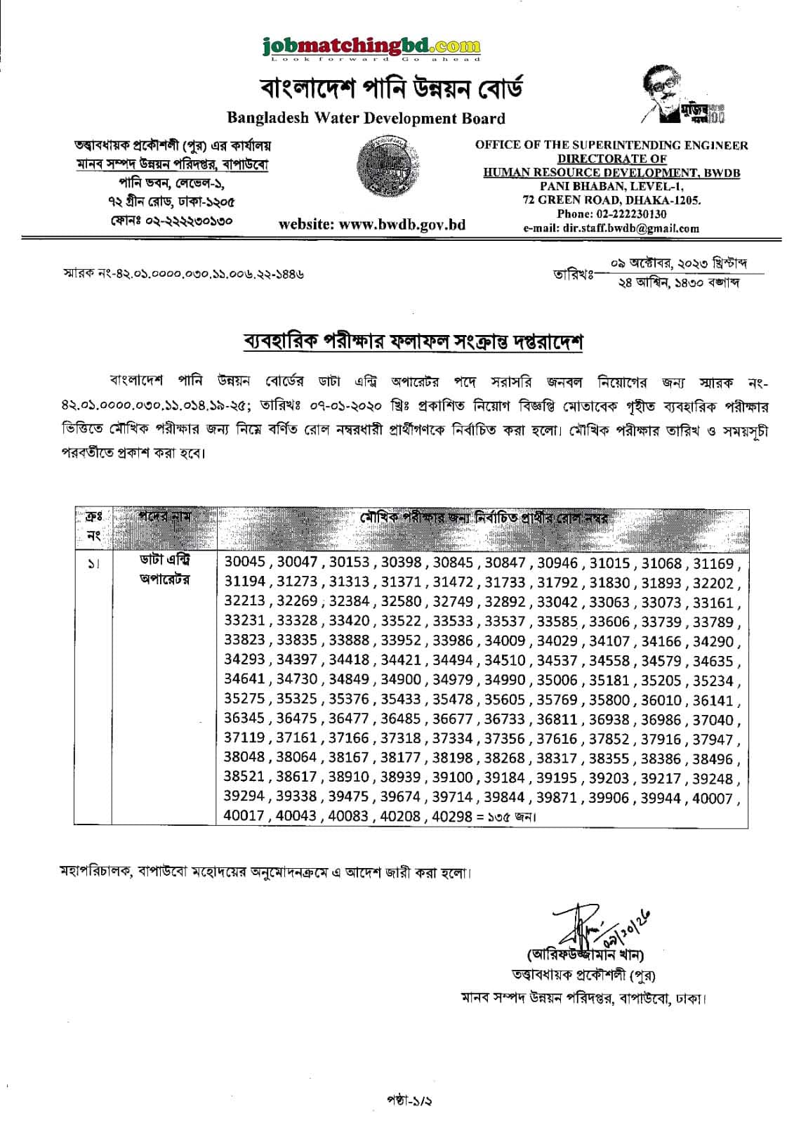 Job Exam Result – বাংলাদেশ পানি উন্নয়ন বোর্ড (bwdb) এর ডাটা এন্টি অপারেটর পদের ব্যবহারিক পরীক্ষার ফলাফল। মৌখিক পরীক্ষার তারিখ পরবর্তীতে প্রকাশ করা হবে।