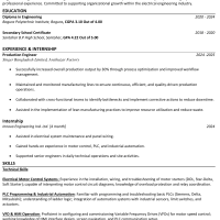 Successfully increased overall production output by 30% through process optimization and improved workflow management. Maintained and monitored manufacturing lines to ensure continuous, efficient, and quality-driven production operations. Collaborated with cross-functional teams to identify bottlenecks and implement corrective actions to reduce downtime. Assisted in the implementation of lean manufacturing practices to improve resource utilization and reduce waste.