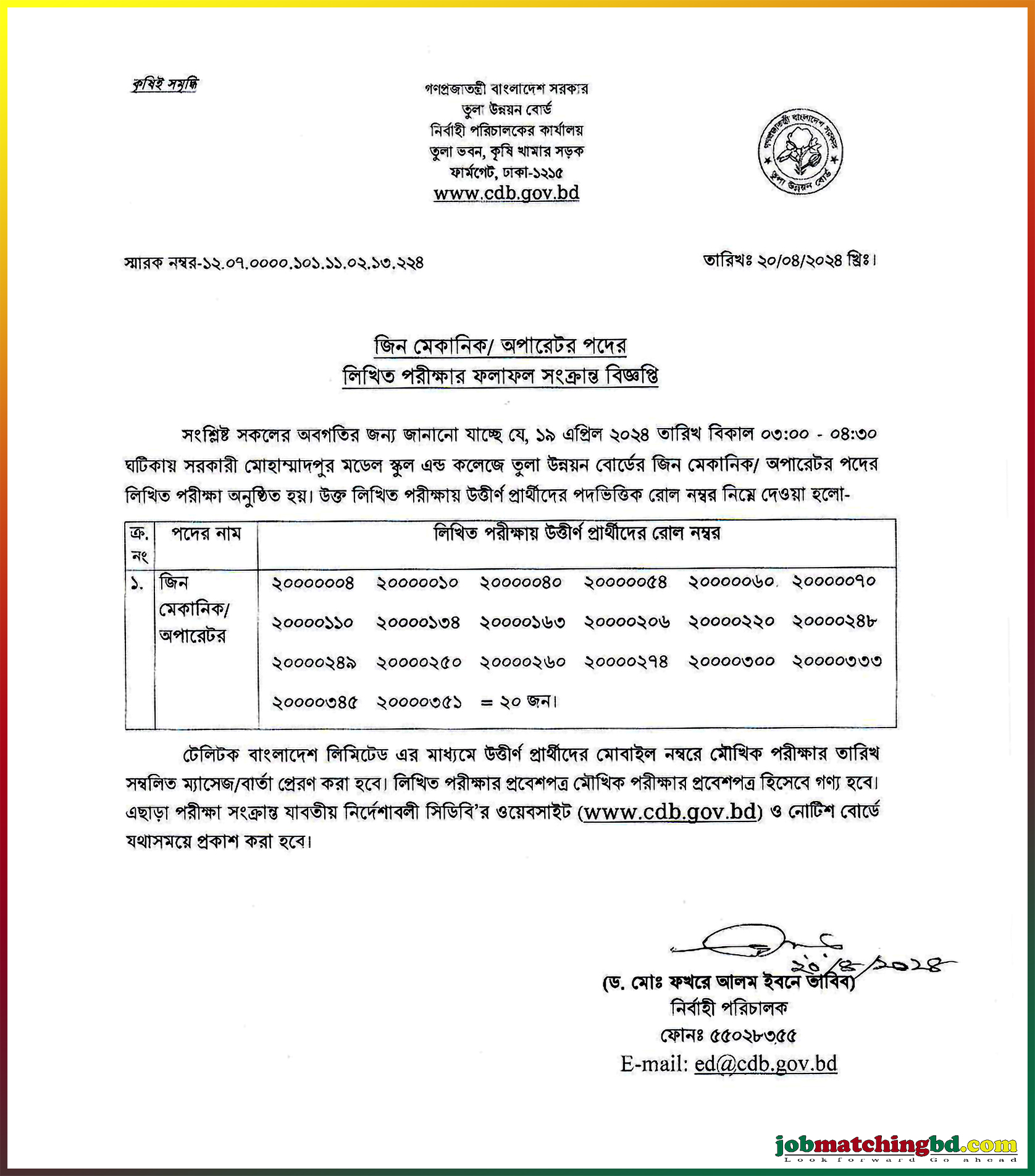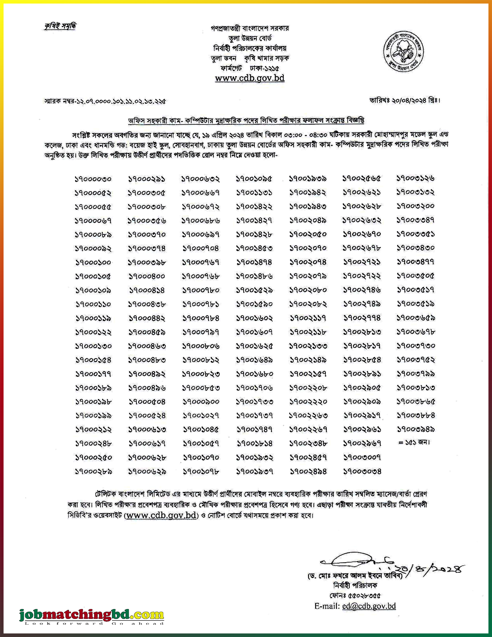 সংশ্লিষ্ট সকলের অবগতির জন্য জানানো যাচ্ছে যে, ১৯ এপ্রিল ২০২৪ তারিখ বিকাল ০৩:০০ ০৪:৩০ ঘটিকায় সরকারী মোহাম্মাদপুর মডেল স্কুল এন্ড কলেজ, ঢাকা এবং ধানমন্ডি গভ: বয়েজ হাই স্কুল, সোবহানবাগ, ঢাকায় তুলা উন্নয়ন বোর্ডের অফিস সহকারী কাম- কম্পিউটার মুদ্রাক্ষরিক পদের লিখিত পরীক্ষা অনুষ্ঠিত হয়। উক্ত লিখিত পরীক্ষায় উত্তীর্ণ প্রার্থীদের পদভিত্তিক রোল নম্বর নিয়ে দেওয়া হলো-