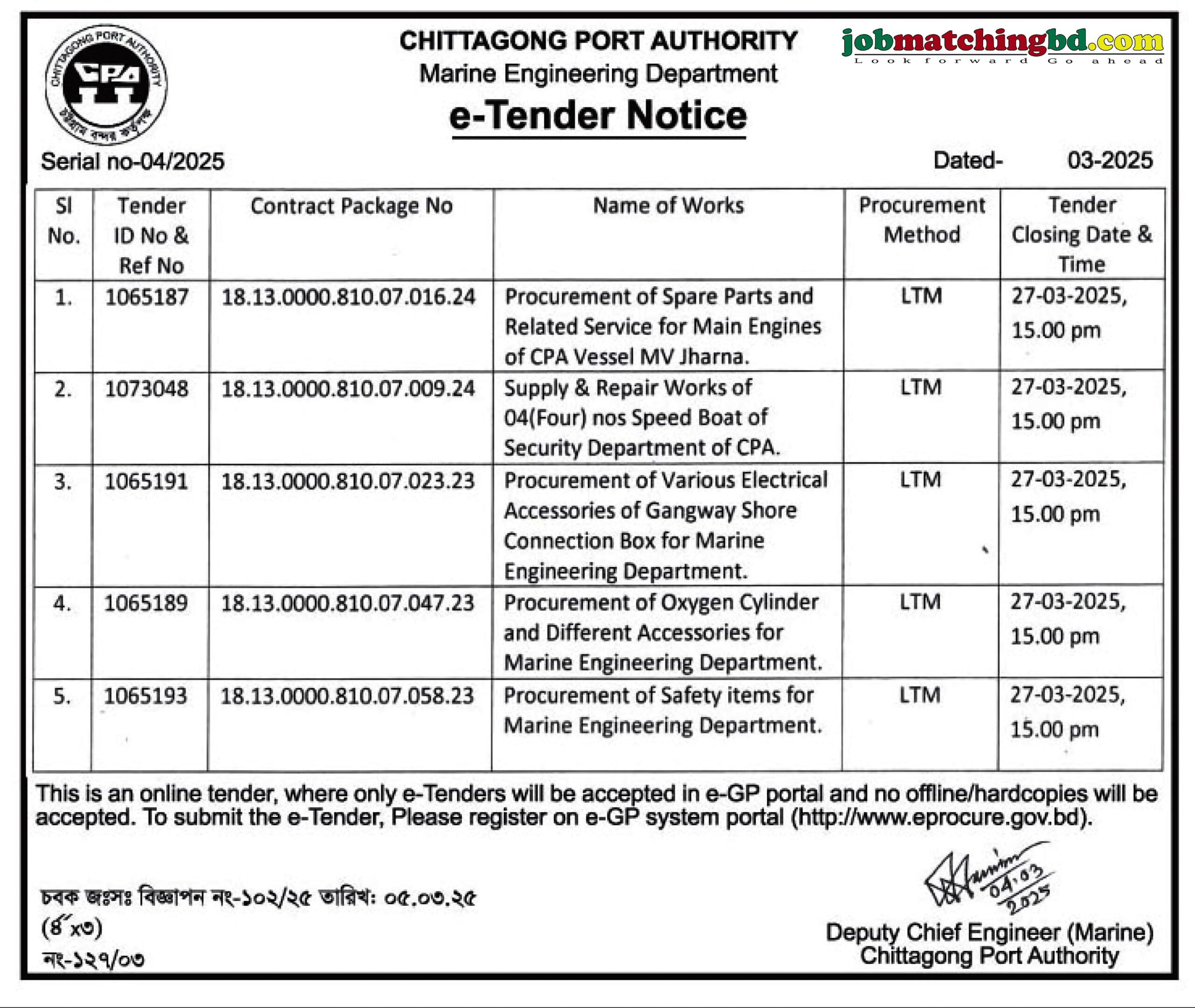 Chittagong Port Authority Tender Notice 2025 Invitation for e-Tender Notice.  This is an online tender, where only e-Tenders will be accepted in e-GP portal and no offline/hardcopies will be accepted. To submit the e-Tender, Please register on e-GP system portal (http://www.eprocure.gov.bd).