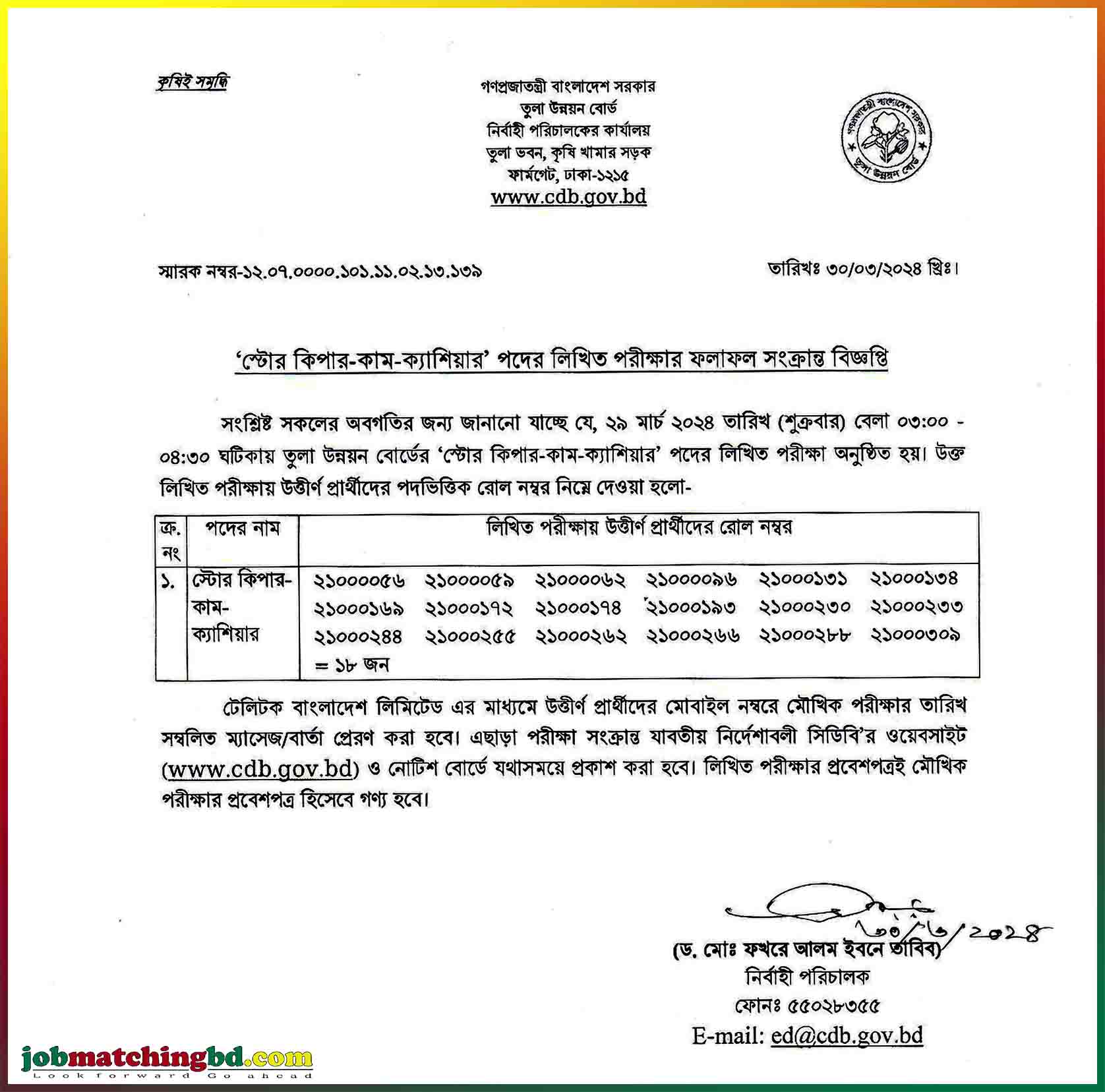 সংশ্লিষ্ট সকলের অবগতির জন্য জানানো যাচ্ছে যে, ২৯ মার্চ ২০২৪ তারিখ (শুক্রবার) বেলা ০৩:০০ ০৪:৩০ ঘটিকায় তুলা উন্নয়ন বোর্ডের ‘স্টোর কিপার-কাম-ক্যাশিয়ার ও ক্যাশিয়ার’ পদের লিখিত পরীক্ষা অনুষ্ঠিত হয়। উক্ত লিখিত পরীক্ষায় উত্তীর্ণ প্রার্থীদের পদভিত্তিক রোল নম্বর নিম্নে দেওয়া হলো-