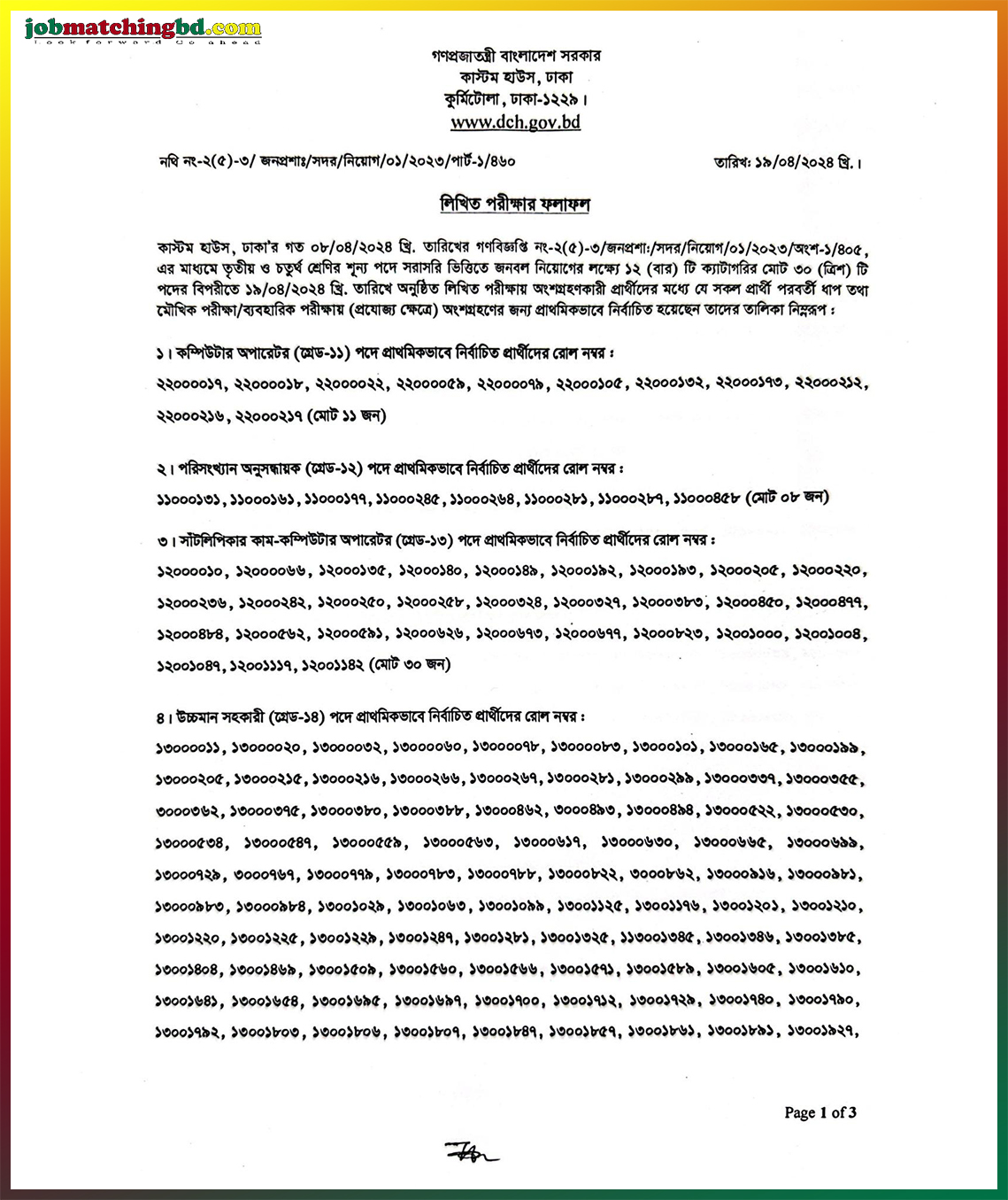 কাস্টম হাউস, ঢাকা’র গত ০৮/০৪/২০২৪ খ্রি. তারিখের গণবিজ্ঞপ্তি নং-২(৫)-৩/জনপ্রশাঃ/সদর/নিয়োগ/০১/২০২৩/অংশ-১/৪০৫, এর মাধ্যমে তৃতীয় ও চতুর্থ শ্রেণির শূন্য পদে সরাসরি ভিত্তিতে জনবল নিয়োগের লক্ষ্যে ১২ (বার) টি ক্যাটাগরির মোট ৩০ (ত্রিশ) টি পদের বিপরীতে ১৯/০৪/২০২৪ খ্রি. তারিখে অনুষ্ঠিত লিখিত পরীক্ষায় অংশগ্রহণকারী প্রার্থীদের মধ্যে যে সকল প্রার্থী পরবর্তী ধাপ তথা মৌখিক পরীক্ষা/ব্যবহারিক পরীক্ষায় (প্রযোজ্য ক্ষেত্রে) অংশগ্রহণের জন্য প্রাথমিকভাবে নির্বাচিত হয়েছেন তাদের তালিকা নিম্নরূপ:
