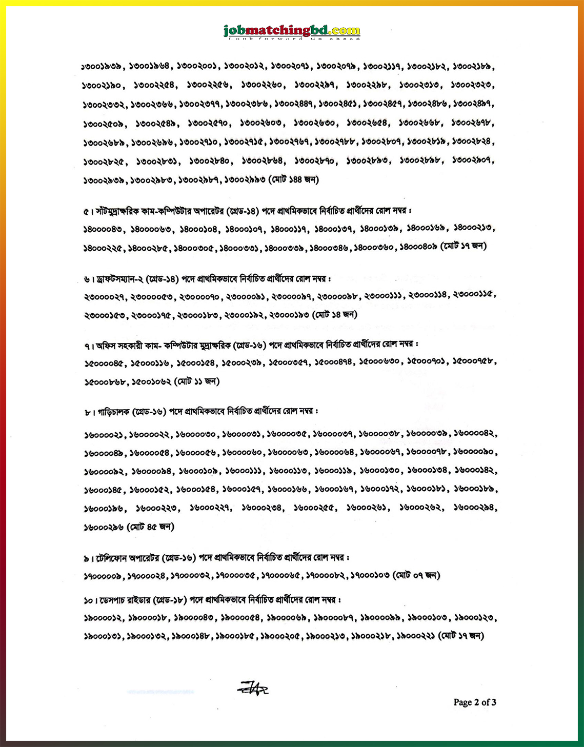 পদের নামঃ ১। কম্পিউটার অপারেটর (গ্রেড-১১) ২। পরিসংখ্যান অনুসন্ধায়ক (গ্রেড-১২) ৩। সাঁটলিপিকার কাম-কম্পিউটার অপারেটর (গ্রেড-১৩) ৪। উচ্চমান সহকারী (গ্রেড-১৪) ৫। সাঁটমুদ্রাক্ষরিক কাম-কম্পিউটার অপারেটর (গ্রেড-১৪) ৬। ড্রাফটসম্যান-২ (গ্রেড-১৪০ ৭। অফিস সহকারী কমা-কম্পিউটার মুদ্রাক্ষরিক (গ্রেড-১৬) ৮। গাড়িচালক (গ্রেড-১৬) ৯। টেলিফোন অপারেটর (গ্রেড-১৬) ১০। ডেসপাচ রাইডার (গ্রেড-১৮) ১১। ডুপ্লিকেটিং মেশিন অপারের (গ্রেড-১৮) ১২। নিরাপত্তা প্রহরী (গ্রেড-২০)