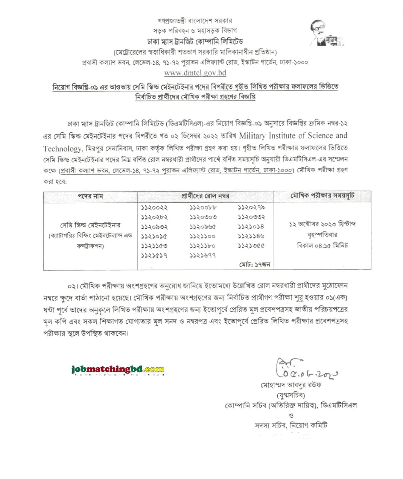 Job Result – ঢাকা ম্যাস ট্রানজিট কোম্পানি লিমিটেড (DMTCL) এর সেমি স্কিল্ড মেইনটেইনার পদের পরীক্ষার ফলাফল প্রকাশ। লিখিত পরীক্ষার ফলাফলের ভিত্তিতে নির্বাচিত প্রার্থীদের মৌখিক পরীক্ষা গ্রহণের বিজ্ঞপ্তি ।