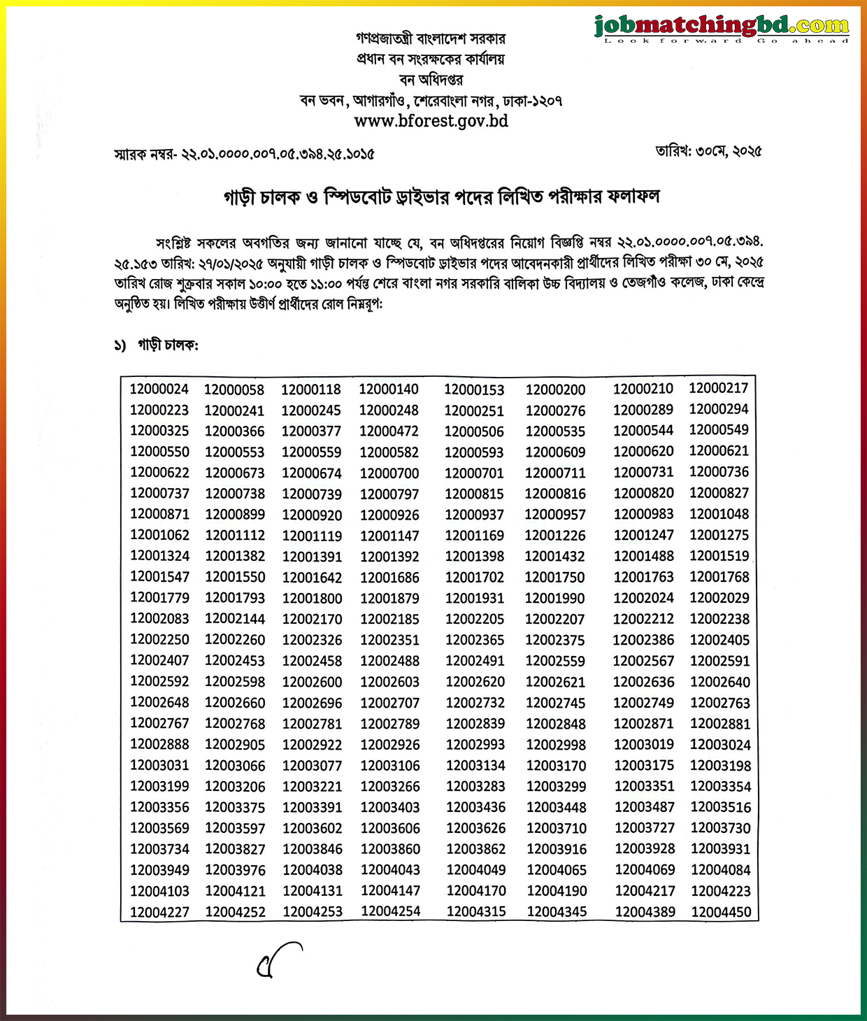 সংশ্লিষ্ট সকলের অবগতির জন্য জানানো যাচ্ছে যে, বন অধিদপ্তরের নিয়োগ বিজ্ঞপ্তি নম্বর ২২.০১.০০০০.০০৭.০৫.৩৯৪২৫.১৫৩ তারিখ: ২৭/০১/২০২৫ অনুযায়ী গাড়ী চালক ও স্পিডবোট ড্রাইভার পদের আবেদনকারী প্রার্থীদের লিখিত পরীক্ষা ৩০ মে, ২০২৫ তারিখ রোজ শুক্রবার সকাল ১০:০০ হতে ১১:০০ পর্যন্ত শেরে বাংলা নগর সরকারি বালিকা উচ্চ বিদ্যালয় ও তেজগাঁও কলেজ, ঢাকা কেন্দ্রে অনুষ্ঠিত হয়। লিখিত পরীক্ষায় উত্তীর্ণ প্রার্থীদের রোল নিম্নরূপ: