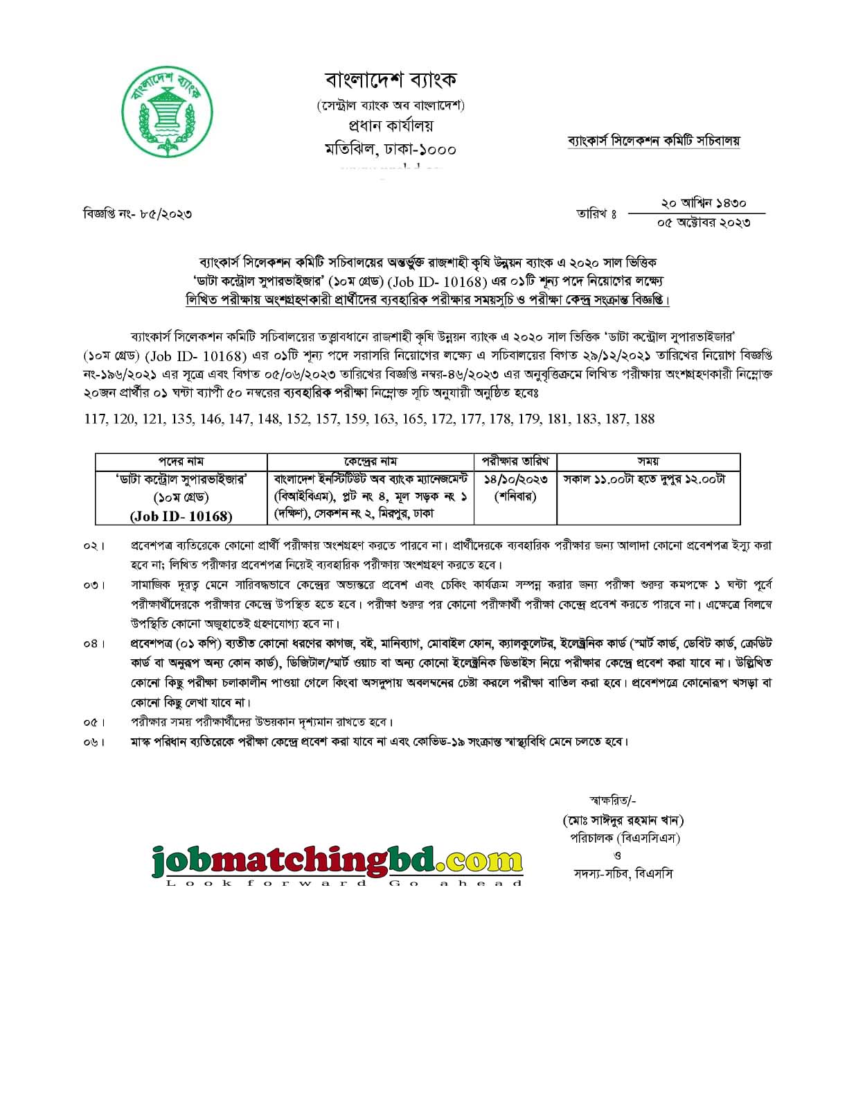 Job Exam Alert – রাজশাহী কৃষি উন্নয়ন ব্যাংক (রাকাব) এর এর শূন্য পদে জনবল নিয়োগের লক্ষ্যে প্রার্থীদের ব্যবহারিক পরীক্ষার সময়সূচি প্রকাশিত হল।