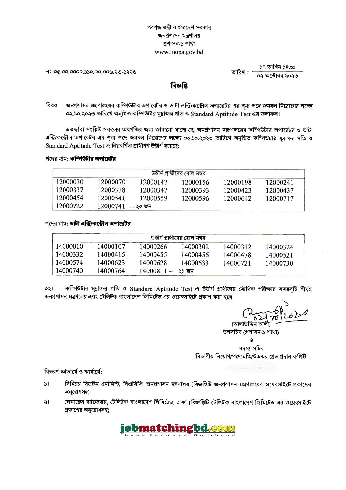 জনপ্রশাসন মন্ত্রণালয় এর নিয়োগ পরীক্ষার ফলাফল – Job News 2023