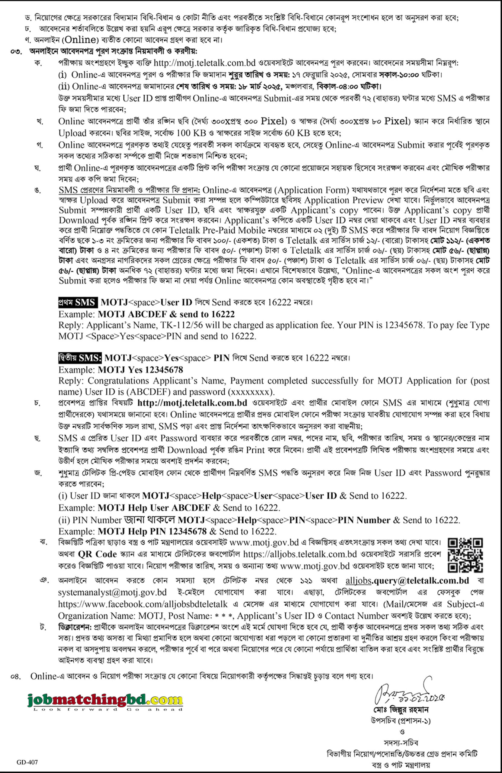 আবেদন প্রক্রিয়া: আগ্রহী প্রার্থীদের http://motj.teletalk.com.bd ওয়েবসাইটের মাধ্যমে আবেদন করতে হবে।