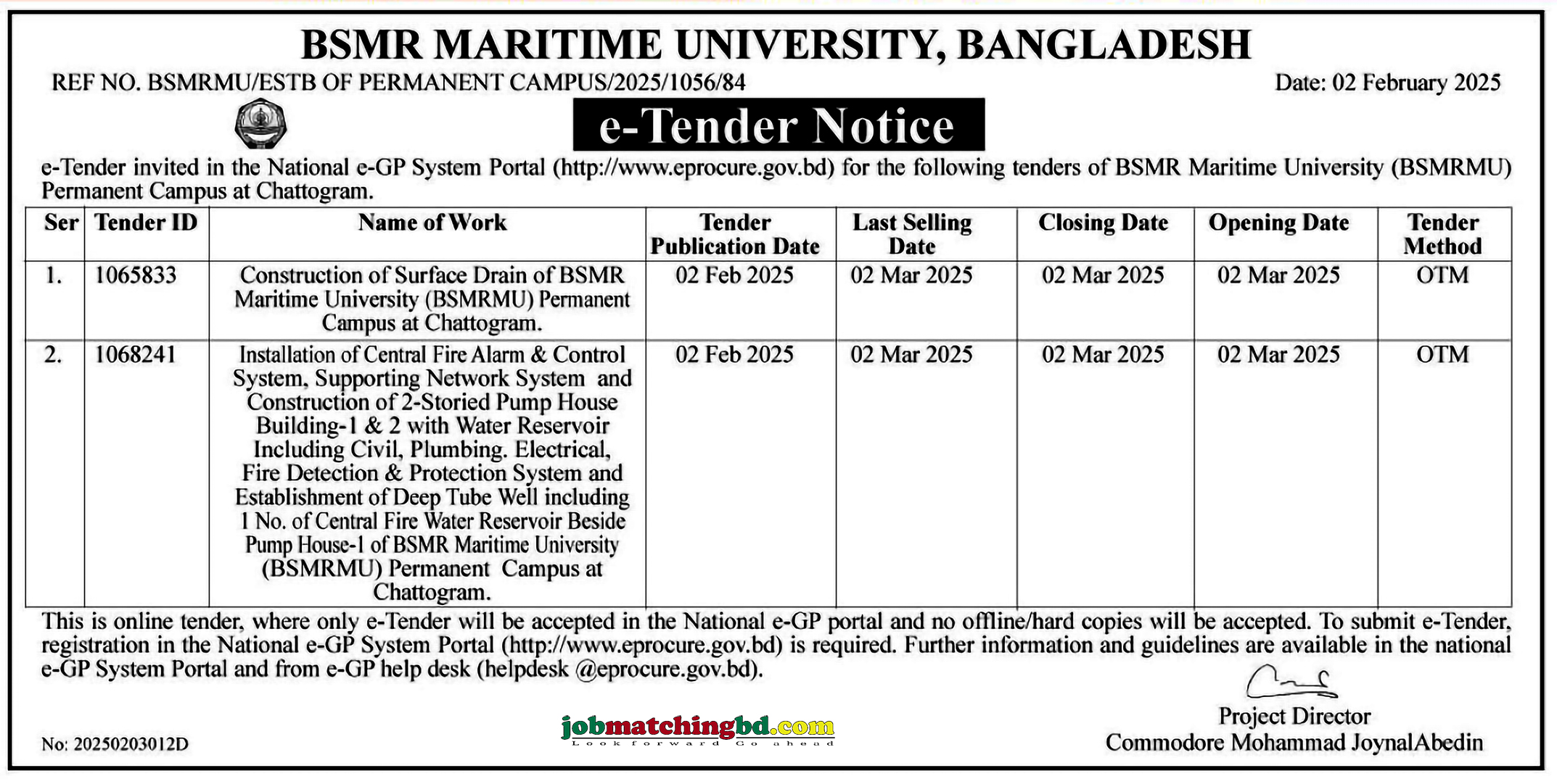 BSRM Maritime University Bangladesh Tender Notice 2025 Invitation for e-Tender Notice. This is online tender, where only e-Tender will be accepted in the National e-GP portal and no offline/hard copies will be accepted. To submit e-Tender, registration in the National e-GP System Portal (http://www.eprocure.gov.bd) is required. Further information and guidelines are available in the national e-GP System Portal and from e-GP help desk (helpdesk @eprocure.gov.bd). Tender Selling Date : 02 March 2025 Tender Closing/Opening Date : 20 March 2025 |