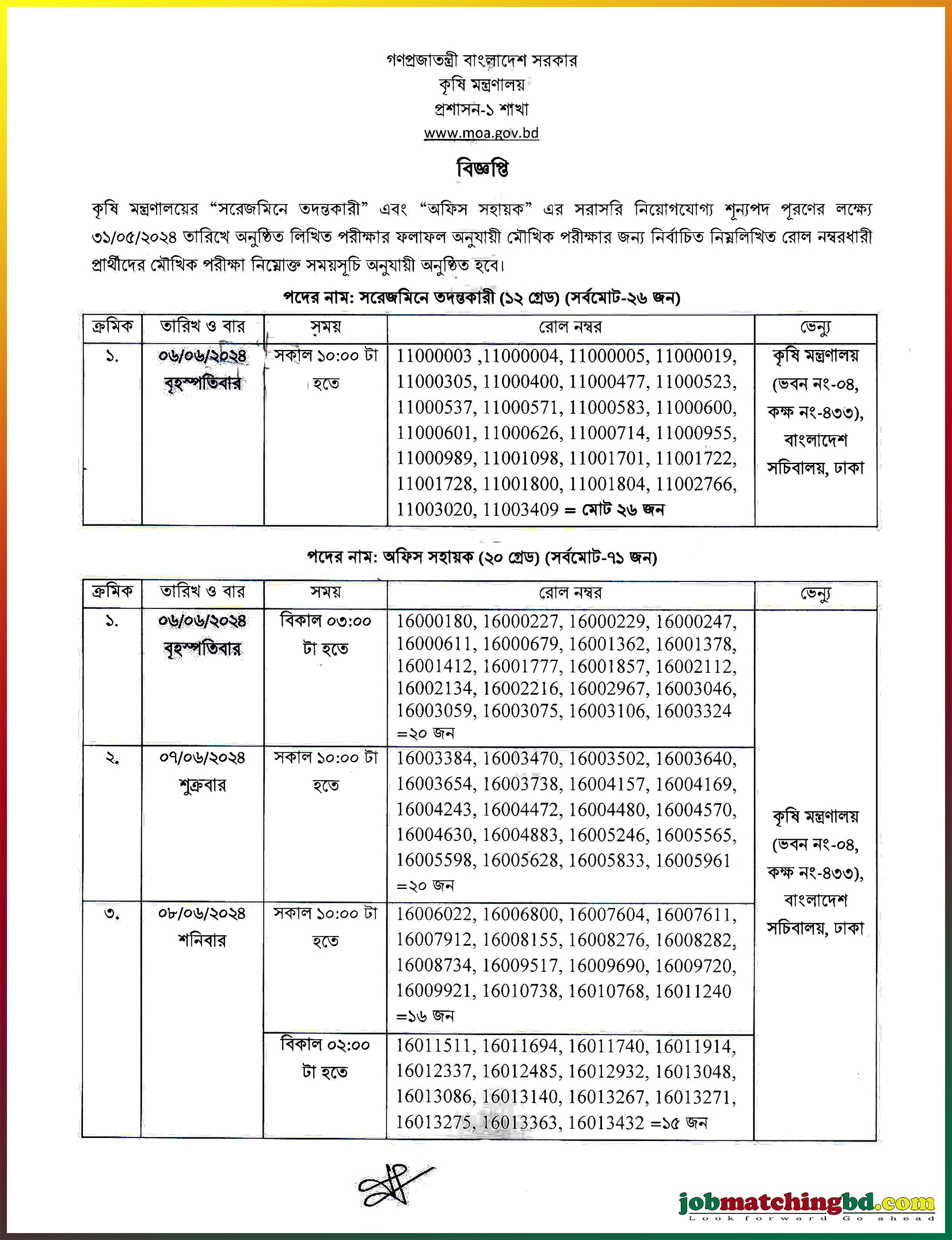 কৃষি মন্ত্রণালয়ের “সরেজমিনে তদন্তকারী” এবং “অফিস সহায়ক” এর সরাসরি নিয়োগযোগ্য শূন্যপদ পূরণের লক্ষ্যে ৩১/০৫/২০২৪ তারিখে অনুষ্ঠিত লিখিত পরীক্ষার ফলাফল অনুযায়ী মৌখিক পরীক্ষার জন্য নির্বাচিত নিম্নলিখিত রোল নম্বরধারী প্রার্থীদের মৌখিক পরীক্ষা নিম্নোক্ত সময়সূচি অনুযায়ী অনুষ্ঠিত হবে।