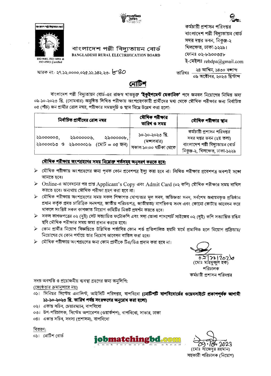 Job Result – বাংলাদেশ পল্লী বিদ্যুতায়ন (Palli Bidyut) বোর্ড-এর রাজস্ব খাতভুক্ত ‘ইকুইপমেন্ট মেকানিক’ পদের লিখিত পরীক্ষার ফলাফল ।